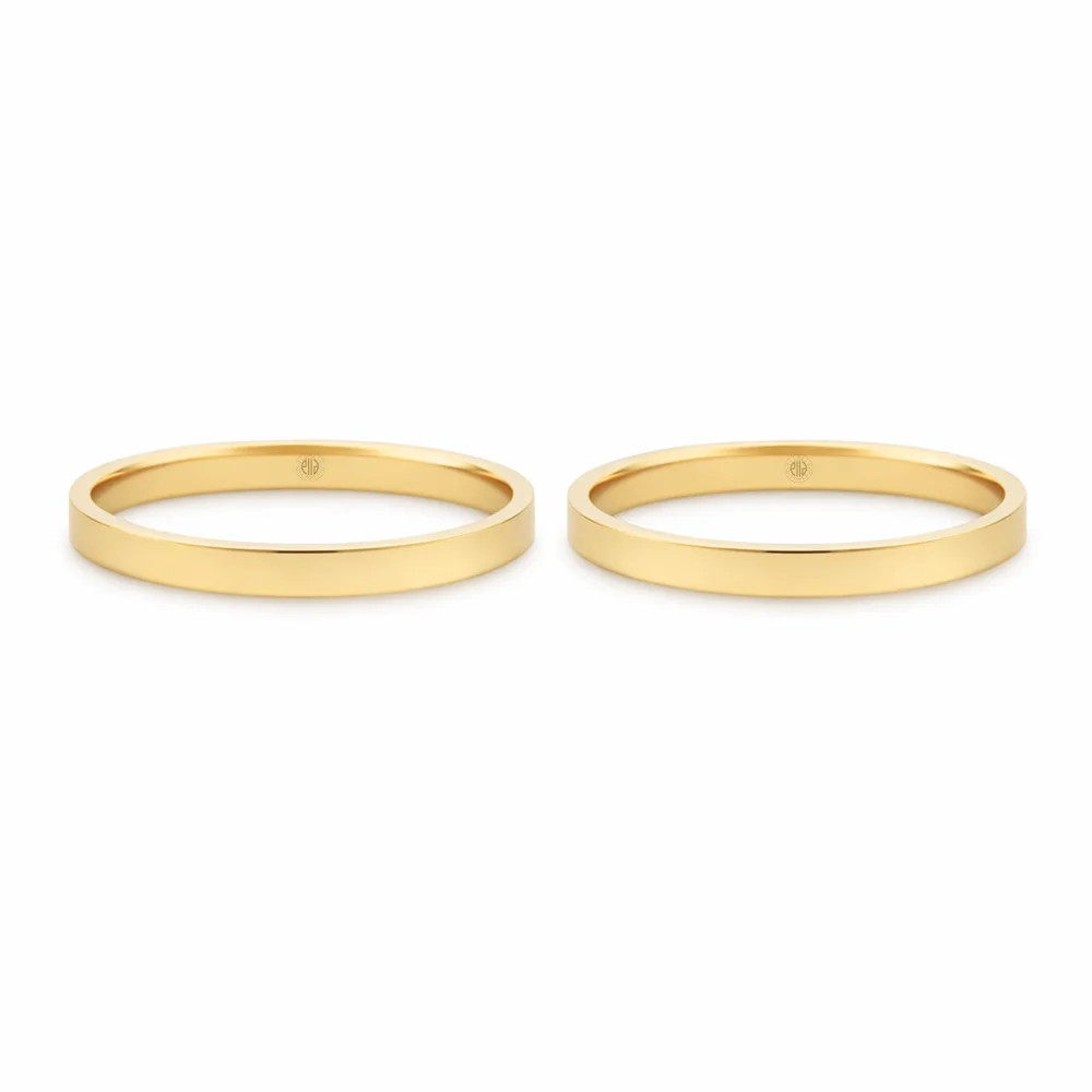 Argollas de matrimonio Flat en oro amarillo 18K macizo, 2 mm de ancho. Perfil exterior recto con interior semi anatómico para mayor comodidad.