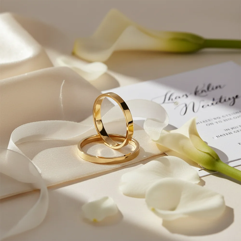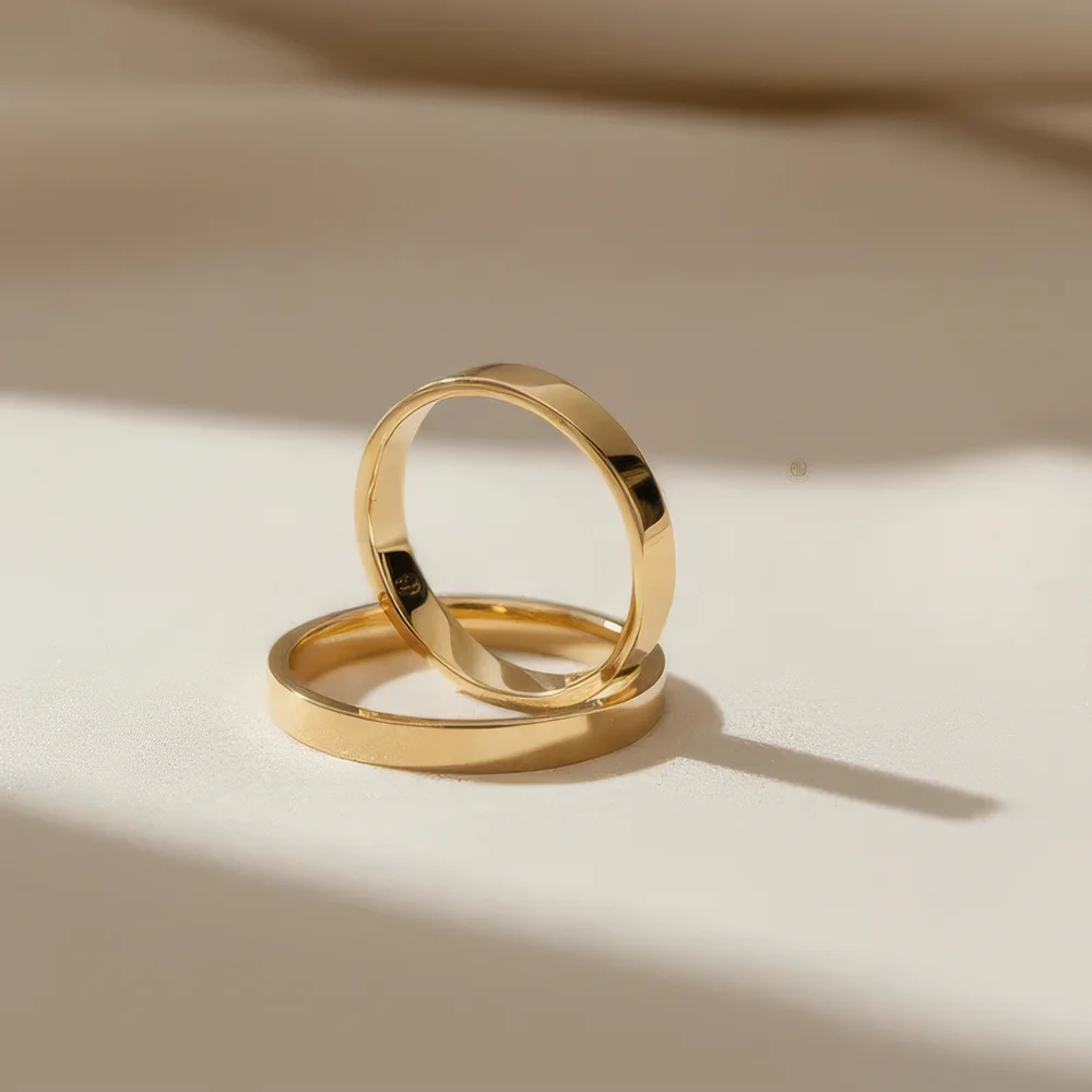 Las argollas de matrimonio modelo Flat en oro amarillo 18K destacan por su diseño moderno, minimalista y elegante. Su perfil recto y líneas definidas crean una estética contemporánea que contrasta con los modelos tradicionales de argollas redondeadas.