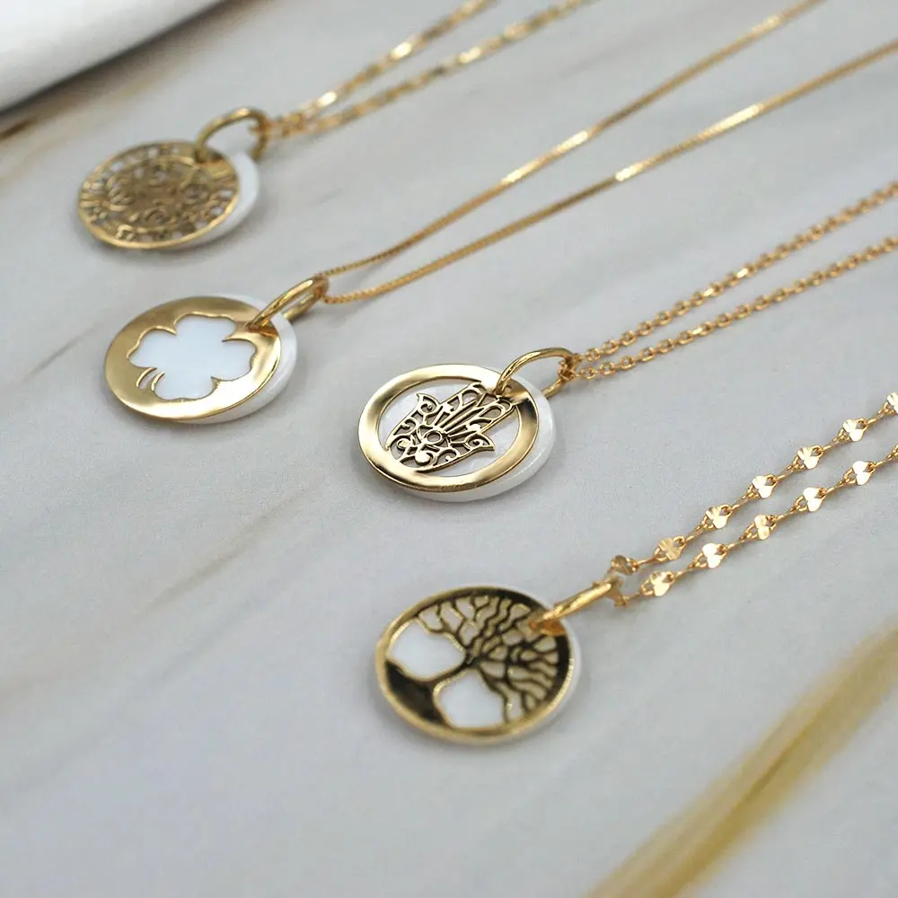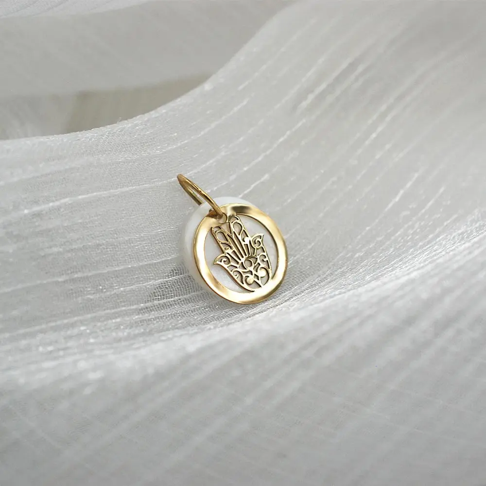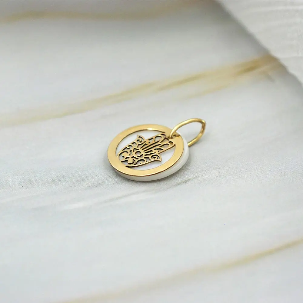 Colgante con medalla de nácar natural y Mano de Fátima en oro amarillo 18k macizo. Diseño elegante, simbólico y protector. Ligero y cómodo.