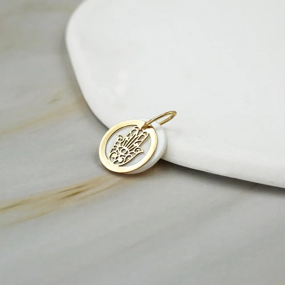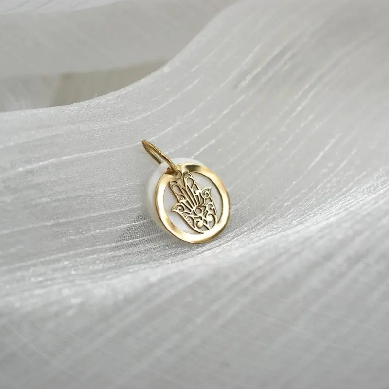 El contraste entre el suave brillo perlado del nácar y el oro reluciente crea una combinación única de texturas, realzada por el movimiento sutil de ambas piezas colgantes. La Mano de Fátima, también conocida como Hamsa, es un poderoso símbolo de protección, buena suerte y energía positiva en diversas culturas.