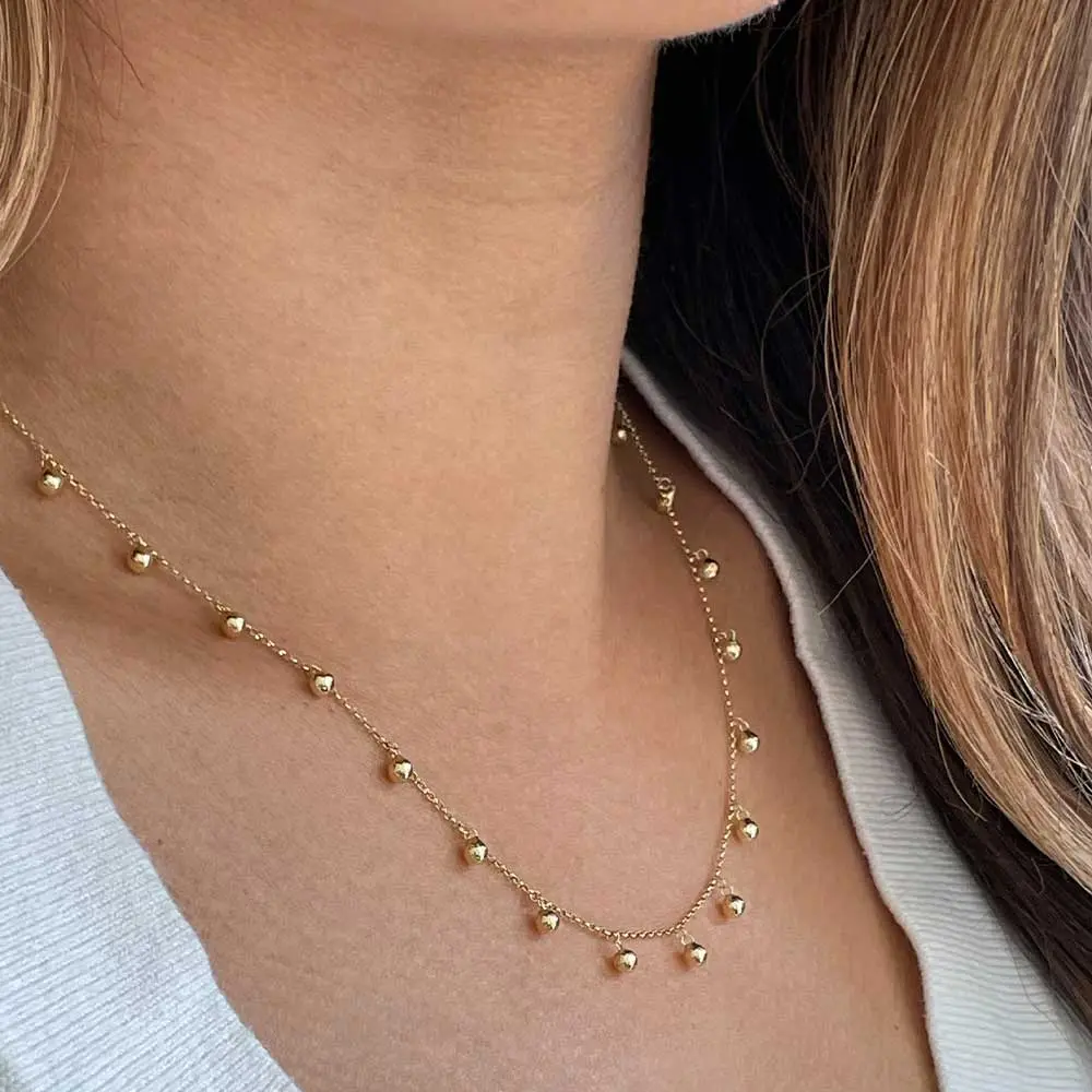 El Collar Joy ha sido minuciosamente fabricado en oro amarillo de 18 quilates, garantizando la máxima calidad y durabilidad. Su diseño exclusivo combina un tejido rolo con bolitas colgantes en todo su largo, aportando un toque de textura y movimiento que realza aún más su belleza.