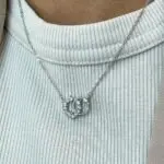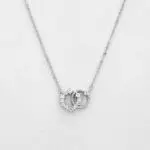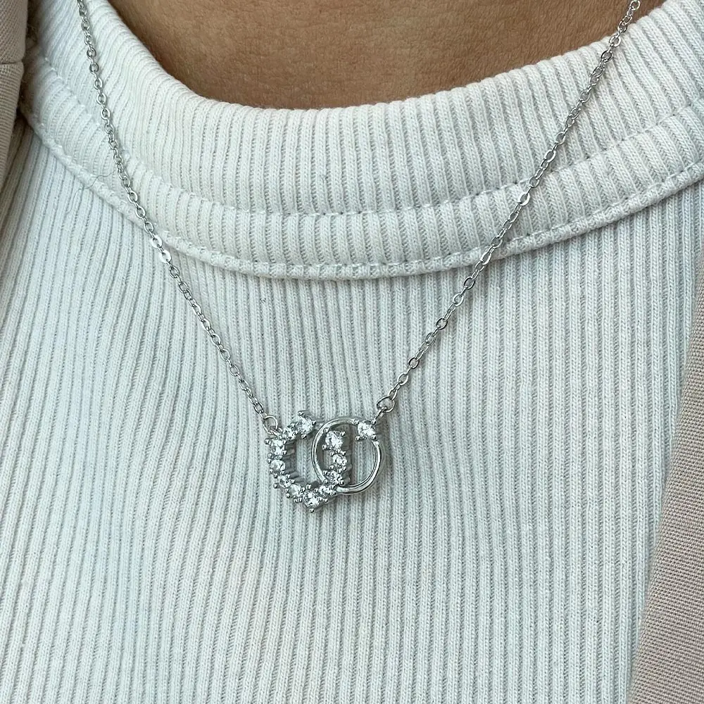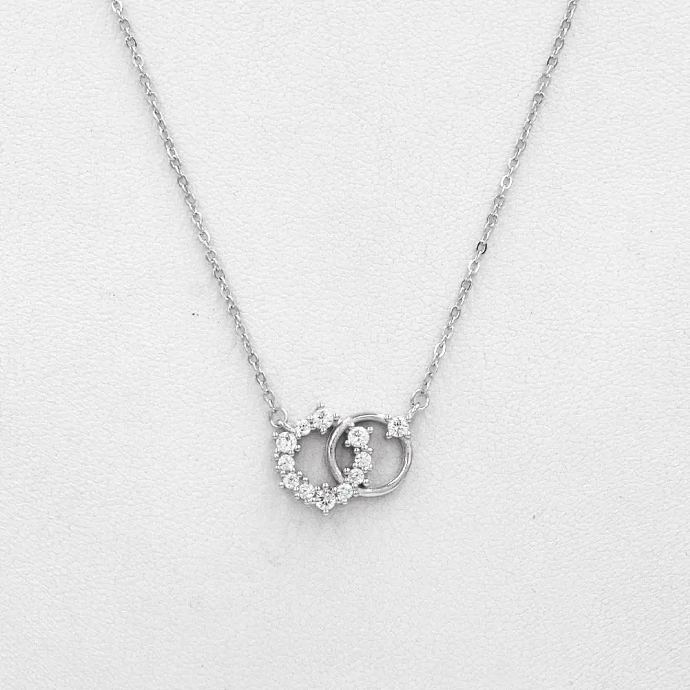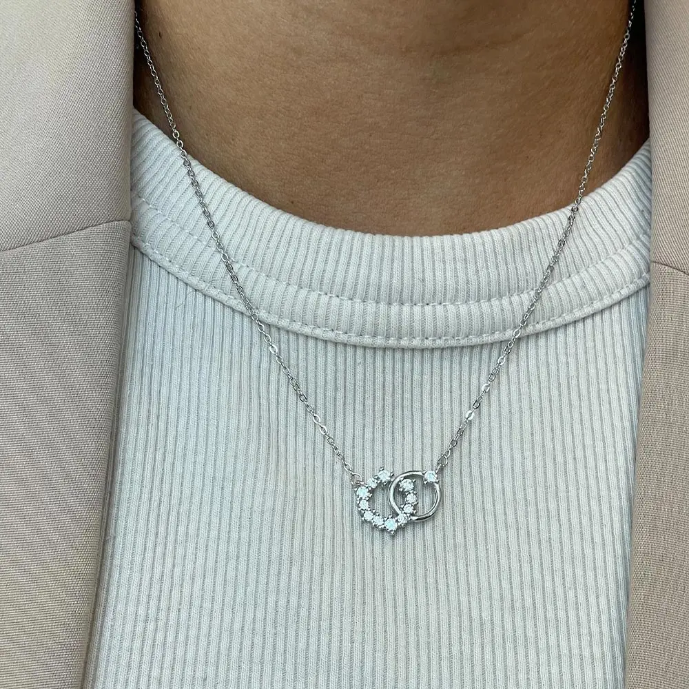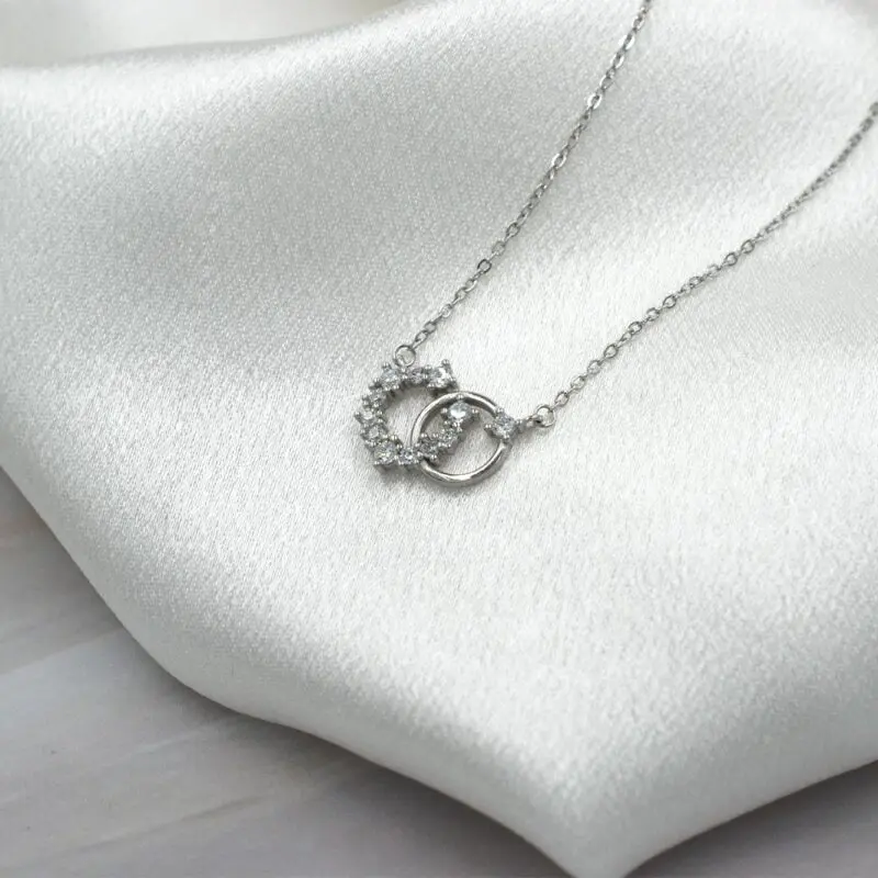 La cadena forcetina mide 40 cm e incluye un extensor de 5 cm, permitiendo ajustar el largo hasta 45 cm. El colgante está compuesto por dos círculos entrelazados: uno completamente liso y otro recubierto con circones blancos brillantes, que capturan la luz y aportan un contraste sutil y sofisticado.