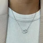 Ambos círculos están unidos de forma fija a la cadena desde sus extremos, lo que asegura un diseño centrado y estable, ideal para lucir con escotes limpios o en combinación con otras joyas finas.