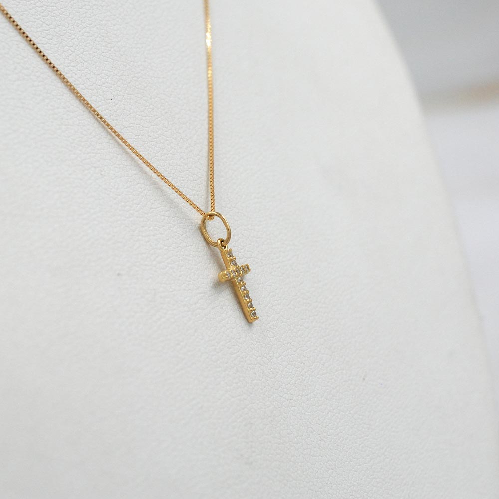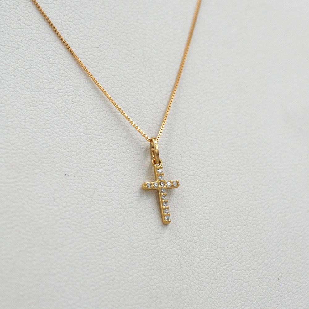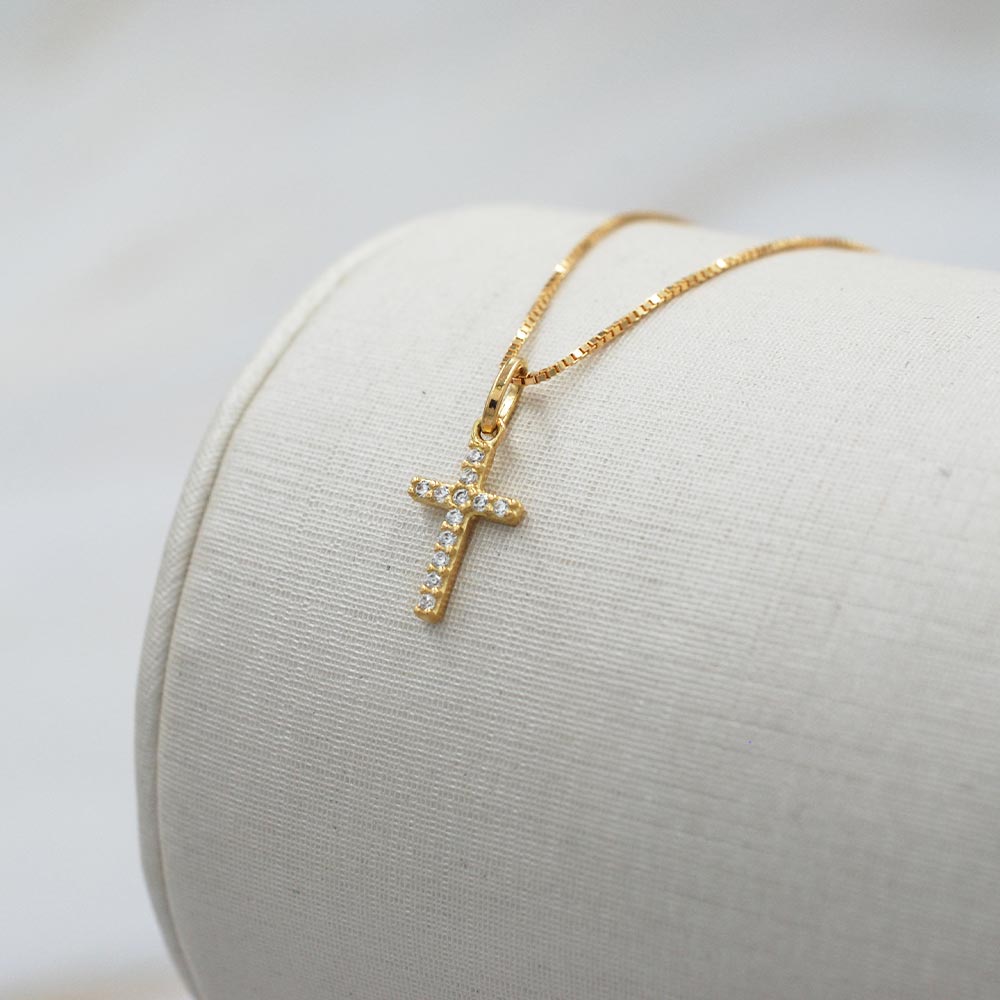 Un conjunto delicado y elegante en oro 18K, diseñado para aportar brillo y significado a tu día a día con su cruz engastada en circones.