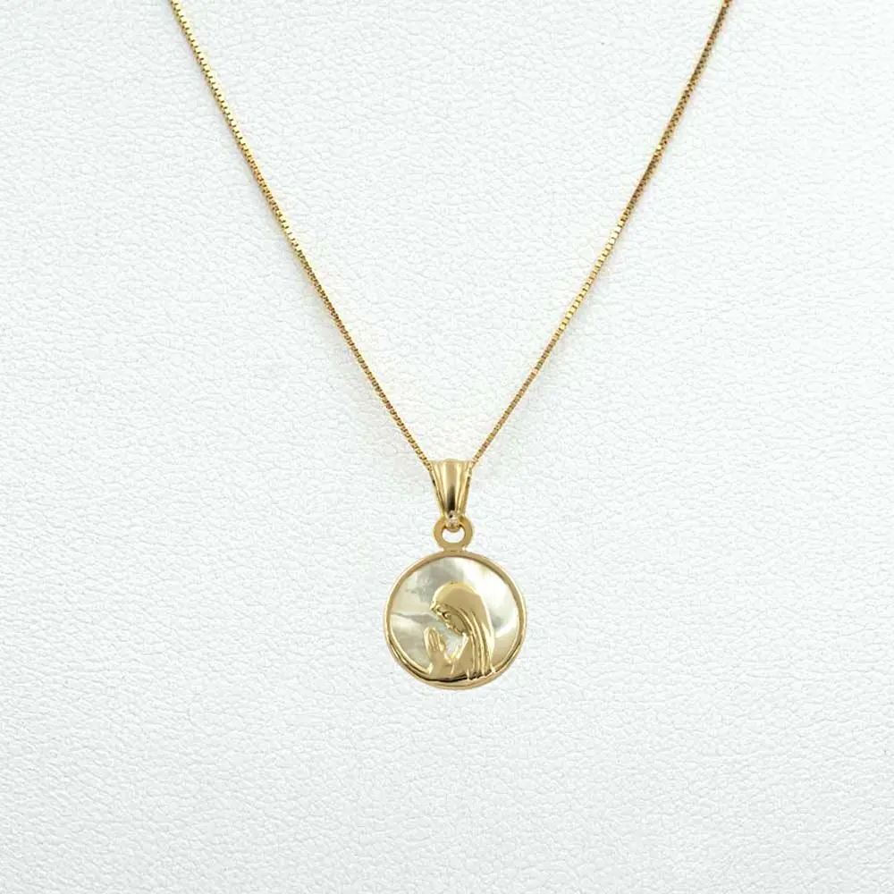 Conjunto Virgen Niña en Oro 18K con medalla de nácar de 12 mm y cadena veneciana de 45 cm. Una joya delicada y significativa, ideal para regalar.