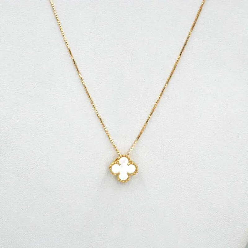 El diseño “galería” del colgante permite que la cadena pase discretamente por detrás, evitando la necesidad de un valier, lo que realza la simplicidad y elegancia del conjunto. Esta característica asegura que toda la atención se centre en la delicada belleza del trébol de madreperla, creando un aspecto limpio y refinado.