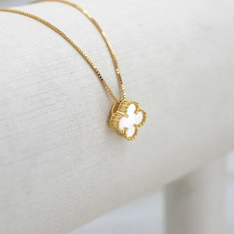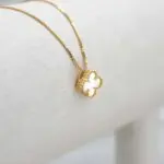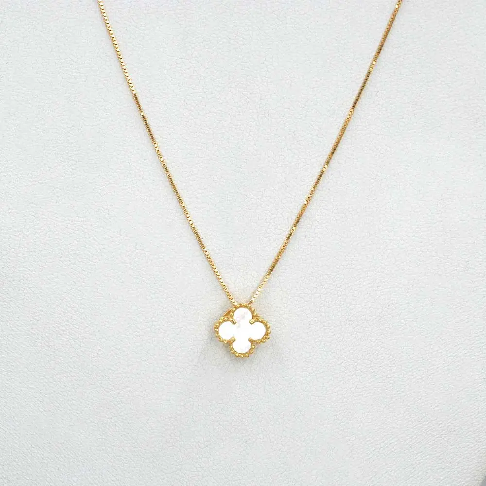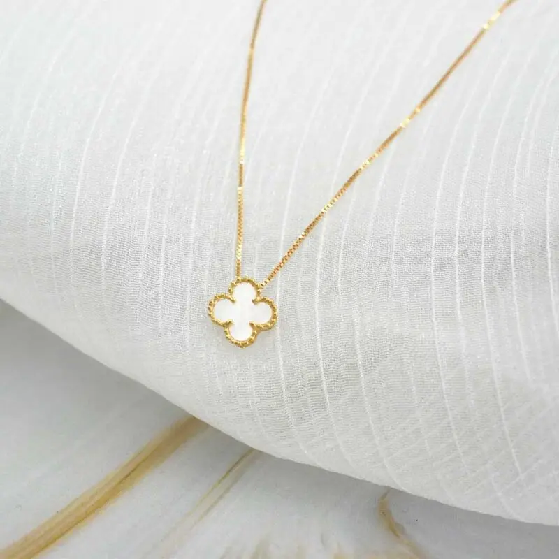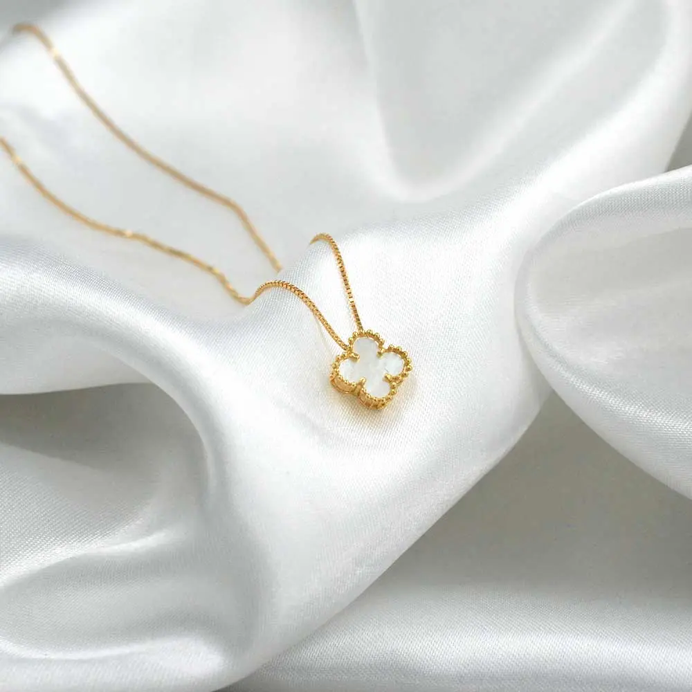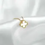 El colgante en forma de trébol no solo es un detalle estético, sino que también simboliza la buena suerte, la esperanza y la prosperidad, cualidades que se asocian tradicionalmente con el trébol de cuatro hojas. La madreperla, conocida por su lustre suave y su conexión con el mar, representa la protección, la pureza y la intuición, lo que añade un significado profundo y espiritual a esta joya.