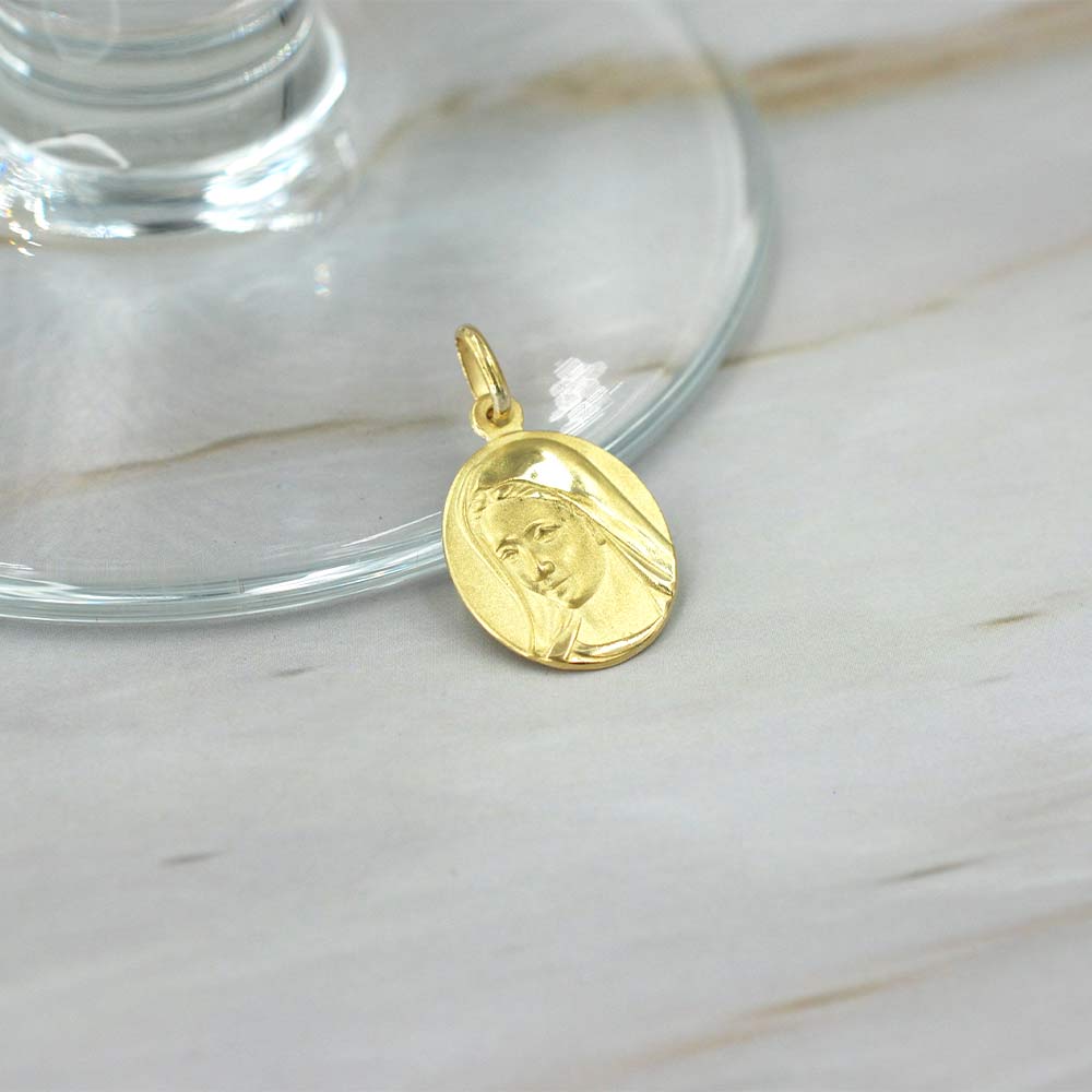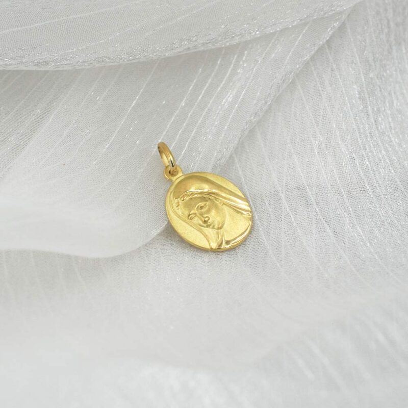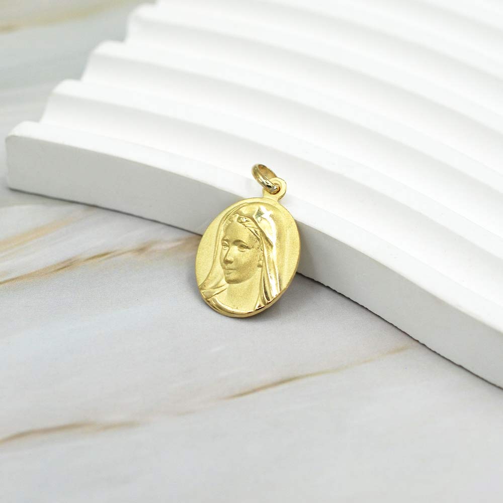 Medalla religiosa de la Virgen de Medjugorje (Reina de la Paz), elaborada en oro amarillo 18K macizo. Su delicado diseño ovalado y su impecable acabado la convierten en una pieza excepcional, llena de significado espiritual y belleza atemporal.