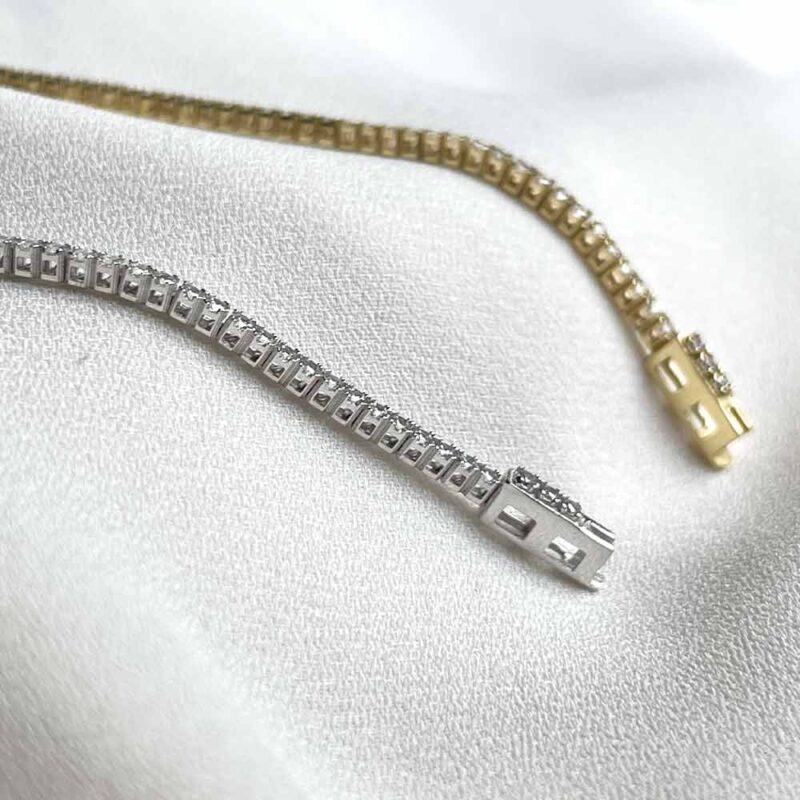 La Pulsera Riviera de Oro 18k es un ícono de la elegancia atemporal, inspirada en el clásico diseño de pulsera tenis que ha conquistado la moda desde los años 80. Su nombre se popularizó durante un partido de tenis cuando la legendaria Chris Evert detuvo el juego para buscar su pulsera, convirtiendo este estilo en un símbolo de sofisticación. Este diseño destaca por su línea continua de circones brillantes, creando un efecto de luminosidad y refinamiento que nunca pasa de moda.