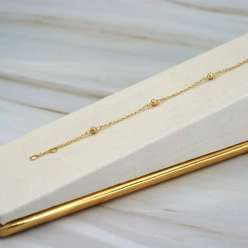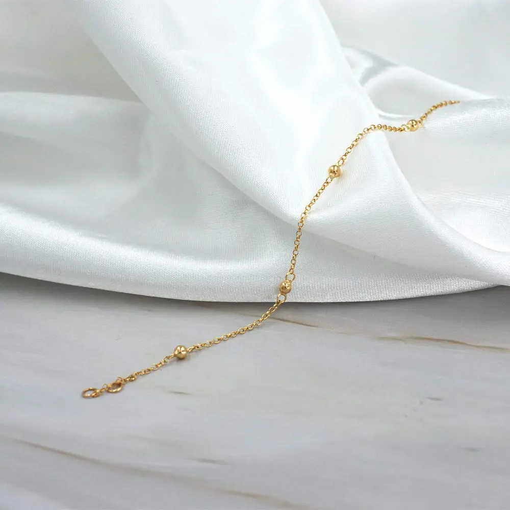 La Pulsera Bolitas 3mm de Oro 18K combina un diseño minimalista con un brillo sutil. Con bolitas de 3mm sobre un tejido rolo mini, tiene un largo de 18 cm, ajustable hasta 19 cm con su extensor. Ligera y cómoda, es perfecta para cualquier ocasión.
